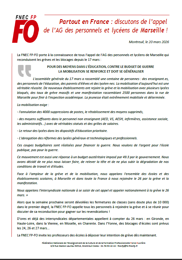 La FNEC FP-FO porte à la connaissance de tous l’appel de l’AG des personnels et lycéens de Marseille qui reconduisent les grèves et les blocages depuis le 17 mars :